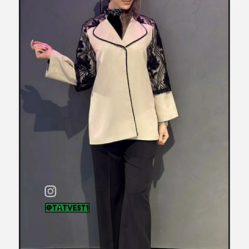 مخصوص عید 1404 بسیار خوش دوخت ومزونی جنس عالی وتنخور عالی روی آستین وسرشانه ویقه گیپور کار شده ودور یقه مروارید دوزی شده